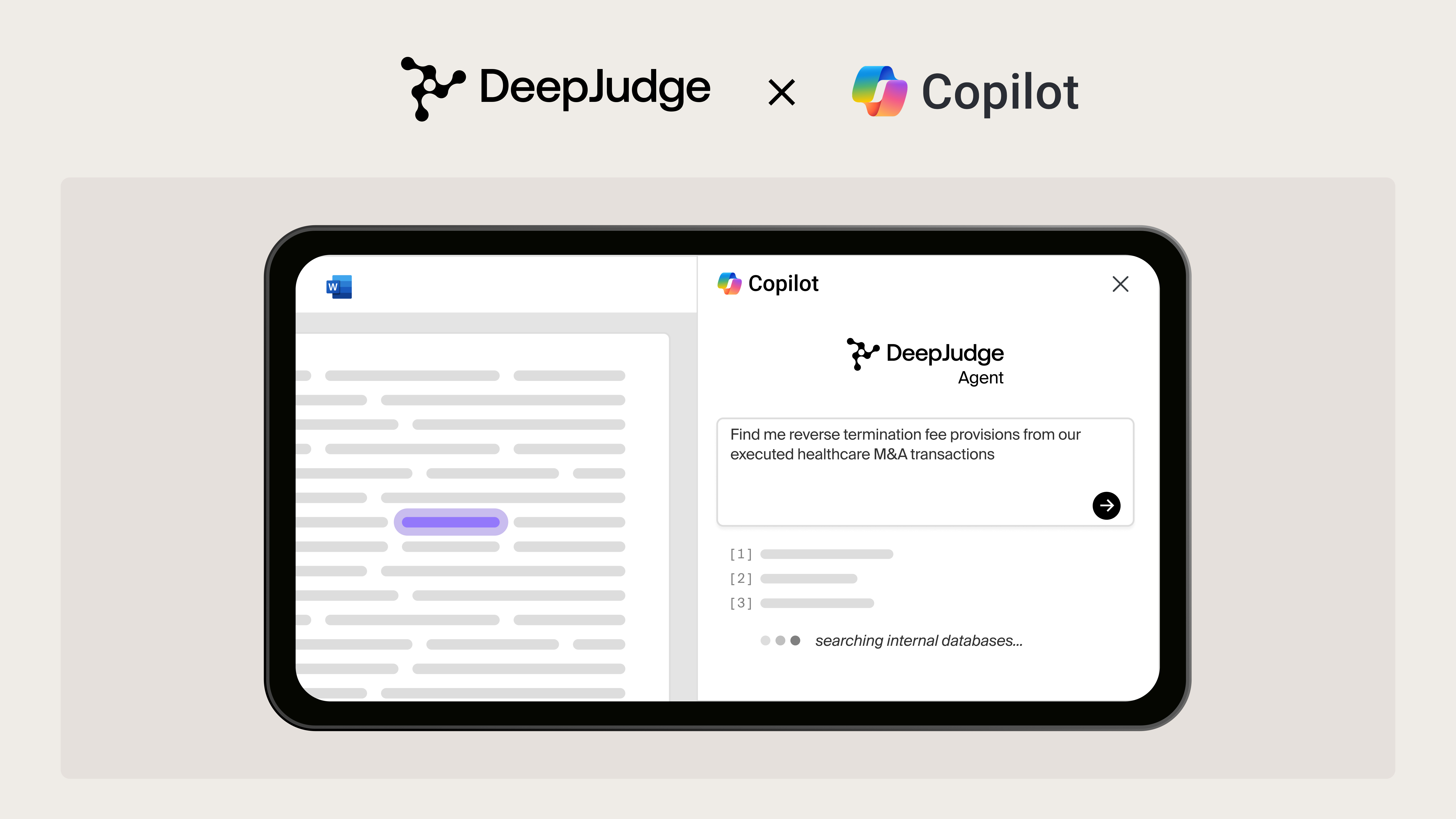 - Leverage your unique legal expertise in Copilot. With DeepJudge connected, Copilot can surface answers from prior matters, documents, and expert insights across your different systems. Lawyers find what they need without leaving the tools they already use.